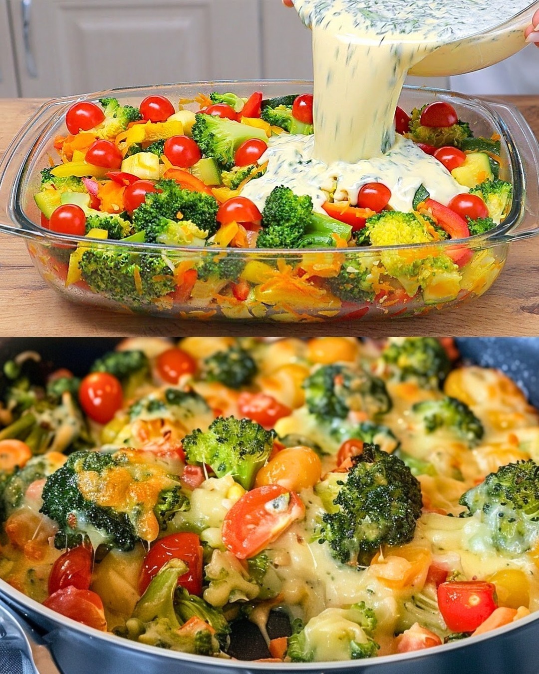 No supper would be complete without this healthy and flavorful  Creamy Baked Broccoli, Tomatoes, and Kale. This dish is both healthy and filling thanks to the blend of crisp broccoli, delicate baby kale, and juicy tomatoes in a velvety sauce. Everyone in the family is likely to love this meal once they see the melted mozzarella  cheese on top. Whether you serve it as a main dish or a side, it’s a great way to eat your veggies. The time required for preparation is twenty minutes. Ten minutes in the oven Time Required: 45 minutes What you need: florets from one big broccoli Extra virgin olive oil A little bunch of young kale chopped onion, one small one 7 minced garlic cloves, tiny 12 cherry or grape tomatoes, cut in half, or 12 tiny tomatoes The butter knob As needed season with salt quarter teaspoon of thyme A 150 milliliter bottle of lotion flour, measuring one tablespoon  Cheese made with crushed mozzarella